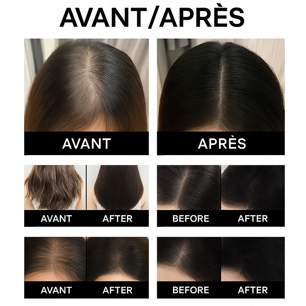 - Résultats attendus (indiqués par la marque) :au bout de 2 mois : apparition de nouveaux cheveux (« baby hair growth »)au bout de 3 mois : réduction visible de l’amincissementau-delà de 4 mois : augmentation du volume capillaire